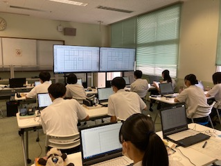 木造平屋建専用住宅を作図していきます。1回目ということでツールバーの説明や作図方法を練習しました。CAI教室を整備していただき環境も昨年度からグレードアップしてます。
