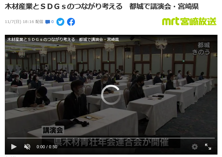 11/6(土)宮崎県木材青壮年会連合会主催でSDGsと木材産業の繋がりと題して株式会社シンク・オブ・アザーズの難波先生を講師に迎え、中山壮で開催。インテリア科生徒60名も参加しました。講演後のパネルディスカッションでは1年生の前畠くんと学科職員も参加意見交換行いました。MRTでも放送されました。