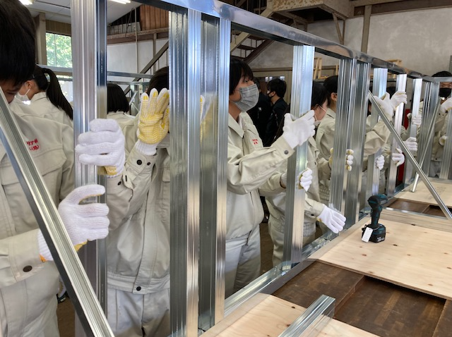講義のあと各班に分かれ、軽量鉄骨の建て込み、ボード貼り、パテ補修から、クロス貼りの一連の流れを体験しました。初めてのことばかりで生徒も真剣に楽しく体験できた1日になったようです。