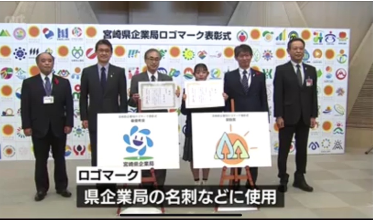 19日MRT放送局で表彰式が行われ、公募544名の中から、最優秀賞のロゴをデザインした東京都のデザイナーの高城豊さん、奨励賞のインテリア科2年山根綺良々さんが、河野知事から表彰状が贈られ、企業局局長、副局長2名も出席されました。