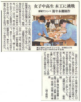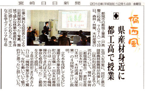 都城の「森林・林業、木材産業を知る!」というテーマで2年生対象に出前授業を実施しました。都城森林組合様、出水木材㈱様、川口木材㈱様、久保産㈱様、そして宮崎県森林産業課様の企画・ご協力で実施しました。インテリア科の生徒諸君がこれを機に更に、木材林業関連に興味関心を持ってくれれば有り難いです。杉材の生産量日本一という宮崎県のアドバンテージを活かして、地域の産業が発展していく為に、都工生達が関わってくれると嬉しいですね。新聞も取り上げて下さったので紹介します。