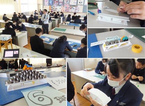 インテリア科の出前授業では「丈夫なペーパーブリッジづくり」「コスパの高いペーパーブリッジづくり」等を個人とグループ学習の両方で実施していただきました。大学の先生によるレベルの高い講義を受講できて生徒達は幸せ者だと思いました。生徒達の創るオリジナリティにあふれた橋の形状に本田先生も感心されていました。
