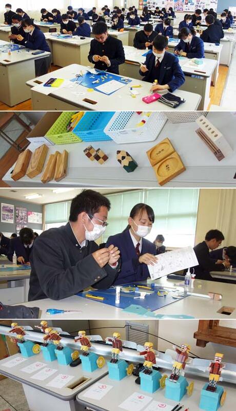 1年生最後の製図の時間はペーパークラフト製作競技としました。男女2人のペアで協力しながら「動くペーパークラフト作り」の完成時間を争う競技です。3時間の制限時間の中で10組以上のペアが完成させることができました。入賞者の諸君には、インテリア科製作の記念品を差し上げました。他人と協力しながらものづくりをするという授業体験でした。