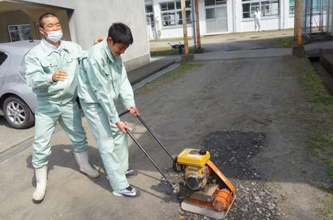 地域・学校貢献はインテリア科ばかりが取り組んでいるのではありません。他学科も積極的に多様な奉仕活動を行っています。先日は建設システム科が、校内通路の補修工事を行っておりました。凸凹部分に砂利を補填し、ランマーという転圧機械で通路を平滑に整えてくれていました。見違えるようにきれいになりました。ありがたいことですm(_ _)m。