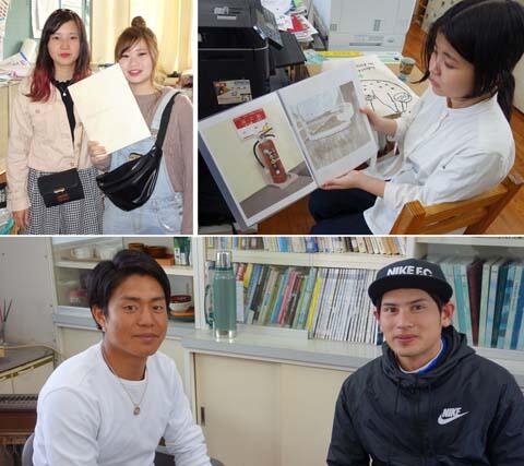卒業生が続々と訪問してくれています。左上は今年度卒業したばっかりの森さんと木幡さん。共に県外に出て女性技能者として頑張る道を選びました。健闘を祈ります!右上は28年度卒業の長谷場さん。大分県立芸術短期大学でデザインを専攻しています。ipadによるドローイングを見せてくれました。下段のいい男 2人組みは26年度卒の田中君と山口君。田中君は日本一の家具メーカー カリモク家具に入社、山口君は東京のPOLUSで頑張っています。積もる話を色々と聞くことが出来ました。嬉しい卒業生ラッシュです。