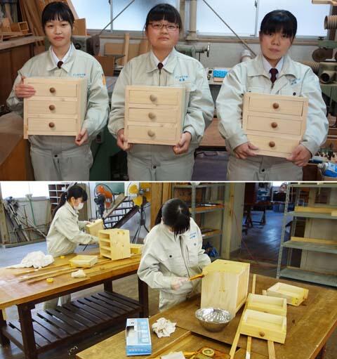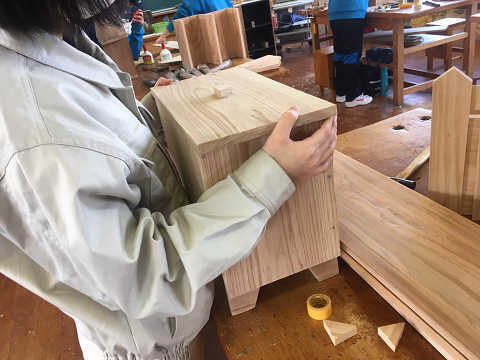 工業高校には運動部、文化部の他に技術部という部活動があります。自分達の所属学科の技能や知識をより高めることを目的に活動しています。インテリア技術部では木工ものづくりの技術修得を目的に、前期に杉製スツール、後期は3段引き出し箱の製作に取り組みました。終業式までには完成し、家に持ち帰ってもらう予定です。後は塗装が乾燥するのを待つばかりです。