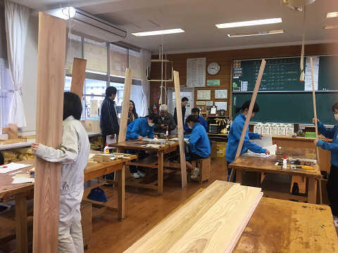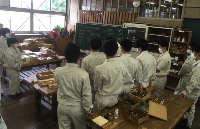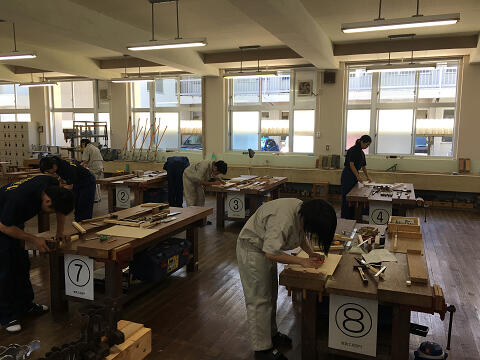 インテリア科では2つの国家技能士検定が受検できます。ひとつが広告美術士 もうひとつが家具手加工です。今年も2年生の希望者17名が家具技能検定にチャレンジしています。講師にものづくりマイスターの田中先生をお呼びして、異なる継ぎ手の木材加工作業に取り組んでいます。インテリア科の先生方も休日返上でサポート頑張ってます。