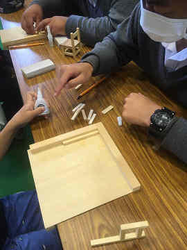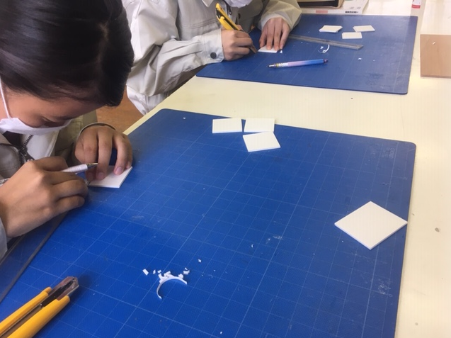 基本工作(木工)、建築模型、平面構成の3班に分かれ、ローテーションで全員がものづくりを学びます。初めてのことばかりで戸惑いもあるようですが、基礎基本を学び成長してほしいです。