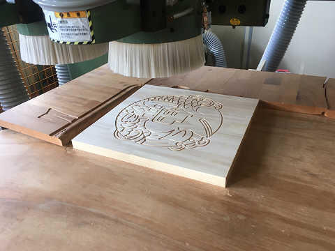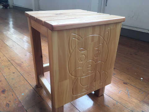 その中でも一番高額な機械?がNCルーターです。パソコンデータ入力し、NCにて板状の木材に加工するものです。生徒は自分でデザインしたもの加工し、椅子(スツール)の側面に取り付けます。オリジナルスツールの完成です。