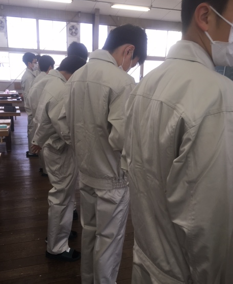 本日、1年生は初めての実習となりました。オリエンテーションで内容説明やレポート記入について話がありました。初めて着用する実習服に袖を通し、なんだか嬉しそうでした。ものづくりを通じ、様々なことを学ぶスタートに立ちました。