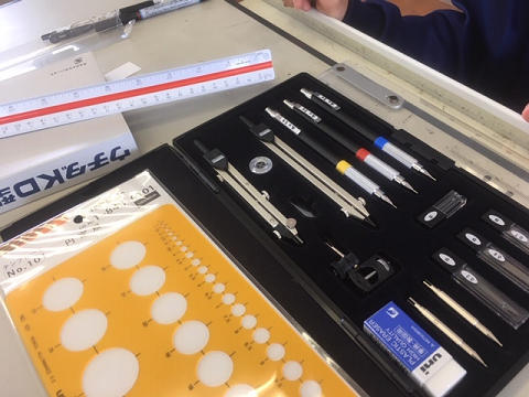 初めての製図台(ドラフター)使用方法や、製図器具セット、三角スケールの説明等を行いました。