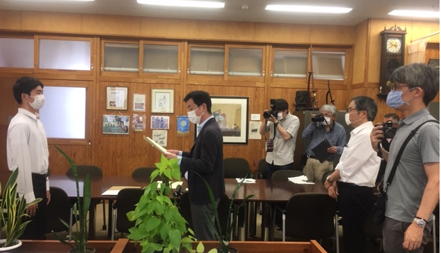 第2回ウッドトランスフォームシステムコンペディションで、本校インテリア科3年の宝満くん【最優秀賞】と、卒業生【優秀賞】を受賞し、本来は東京での表彰授賞式と北海道での作品制作が実施予定でしたが、コロナウイルス感染症の影響で中止となり、本校校長室で表彰式を行いました。たくさんの報道機関関係者が来校し取材。近日中に各社掲載されます。