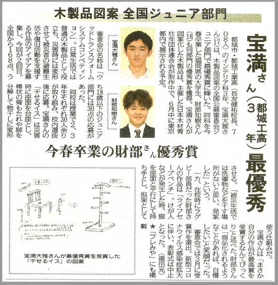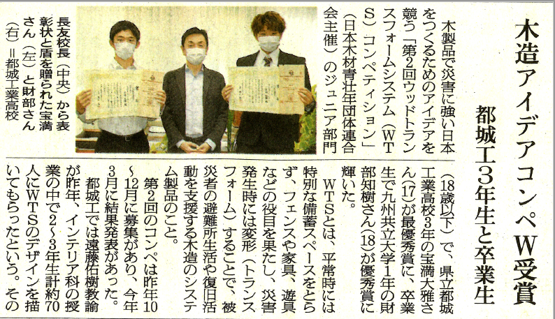 都城市木青会様からの紹介で3年生に挑戦してもらったウッドトランスフォームシステムコンペの審査結果が届きました。全国から集まったたくさんの応募の中で、なんと本校インテリア科3年生の種子田優奈さんの作品が入選しました!おめでとうございます。加えて学科を挙げての応募が評価され、「審査委員特別賞」を都工インテリア科が頂戴することになりました。光栄なことです。年度末の嬉しいサプライズになりました。
