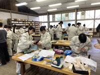 放課後の実習室では、ウクレレを仕上げるため生徒が頑張っていました。
