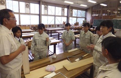 インテリア科では2つの国家技能検定試験が受験できます。ひとつが広告美術士、そしてもうひとつが家具手加工です。広告美術士が3年生対象に対し、家具手加工は2年生受験としています。木工の基本的な仕口加工技術を用いて、額縁状の作品を2時間半で作り上げる家具手加工スキルを検定するものです。今年は17名が受験です。講師はものづくりマイスタで元宮崎工業高校インテリア科教諭の田中義雄先生です。先生の巧みな話術と木技術で全員合格を目指します。