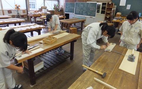 1年生が基本工作の授業で工具箱を製作しています。自分所有の鋸や鉋を収納するための工具箱を鑿や鉋を使用しながら、自らの手で作り上げます。卒業時には想い出や他の作品とともに持って帰れます。実習担当者の話では、今年の1年生はなかなか上手だそうです。♡