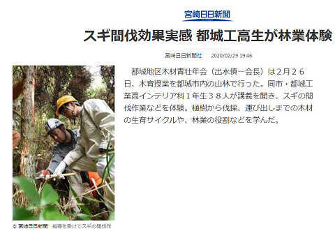 都城の「森林・林業、木材産業を知る!」というテーマで2年生対象に出前授業を実施しました。都城森林組合様、出水木材㈱様、川口木材㈱様、久保産㈱様、そして宮崎県森林産業課様の企画・ご協力で実施しました。インテリア科の生徒諸君がこれを機に更に、木材林業関連に興味関心を持ってくれれば有り難いです。杉材の生産量日本一という宮崎県のアドバンテージを活かして、地域の産業が発展していく為に、都工生達が関わってくれると嬉しいですね。新聞も取り上げて下さったので紹介します。