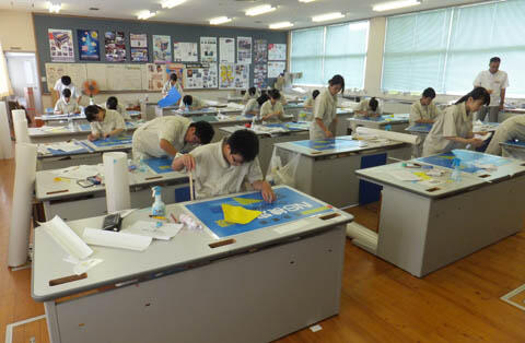 国家技能士 広告美術士の受験に向けて3年生18名が奮闘中です。いわゆる看板広告を指定された時間内できれいに正確に完成させる技術を検定する試験です。インテリア科のデザイン教育の一環として希望者受験を行っています。外部講師の先生をお招きして4日間の課外を実施し、例年合格率80~100%を誇ります。