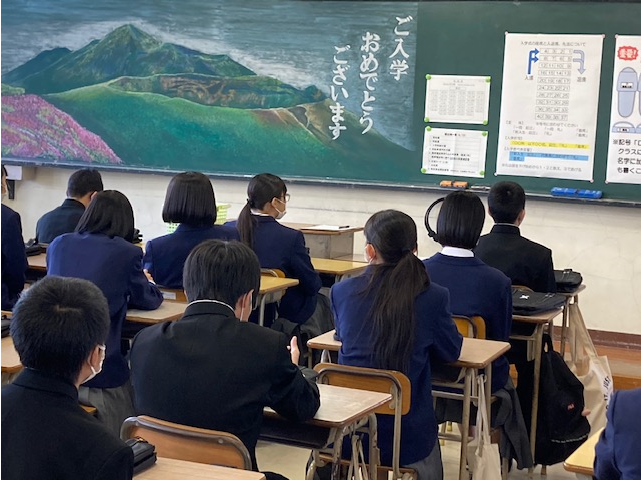 第63回入学式が行われ、インテリア科は恒例の黒板アートで新入生を迎えました。