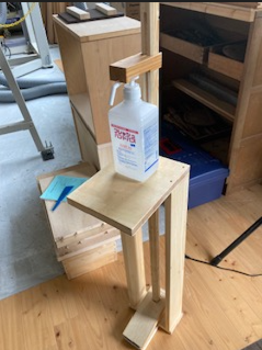 昨日、木製消毒スタンドの試作1号を製作しました。今後、強度や使い勝手を検証改良し2号機制作する予定です。