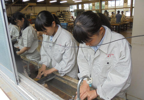 1年生の実習授業風景のレポートです。工業基礎という授業の中で、基本工作、デザイン、建築模型に取り組んでいます。写真は基本工作班の鉋刃の研磨授業とデザイン班のレタリング授業です。1年生で基礎を学び、2年生で応用、3年生で課題研究にまで発展させます。