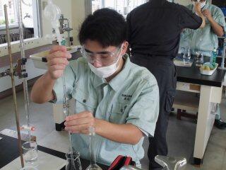 化学工業科の3年生で行う実習で、材料となる物質から 様々な反応を利用して別の物質を作ります。
