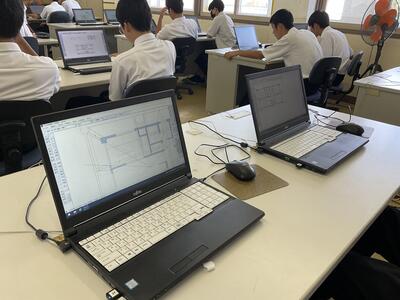 1年生は、CADソフトを用いて鉄筋コンクリート構造の俯瞰図(ふかんず)に挑戦中です。