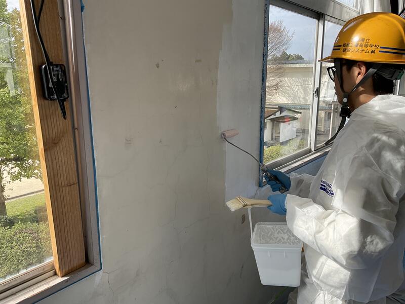 生徒たちは、塗装協会に所属されている講師の方々の指導を受けた後、刷毛やローラーを使いながら丁寧に塗装を行っていました。