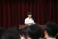 「九州大会に出場するものづくりコンテストの選手の皆さん、九州大会という大きな舞台で戦う事を誇りに思います。ロボット競技部の皆さんは勝てば全国大会というプレッシャーはあるかと思いますが、1試合1試合頑張ってください。野球部の皆さん、これまでの3年間の集大成を出し切り甲子園を目指してください。」と生徒会代表の激励の言葉をいただきました。