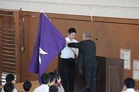 ○旗手は男子バスケットボール部主将 新留翔吾くん(末吉中出身),選手代表宣誓は女子ハンドボール部主将 日高あかりさん(高城中出身)