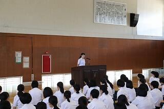表彰伝達式では、県ジュニア選手権大会、女子円盤投部門で第3位となった3年生の酒匂華音さん、そしてTSP杯争奪総合団体卓球大会、高校男子団体部門で第3位となった卓球部代表、3年生の森重太晴くんの2人がそれぞれ表彰を受けました。