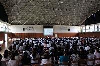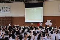 授業参観の後は、体育館での全体会。生徒会作成の動画やクイズなどで都西のことを知っていただきました。