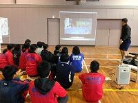 市内外の陸上部を中心に生徒150名が集まり、講師の先生の講演・その後陸上競技の基礎トレーニング・ハンマー投の体験交流会がありました。