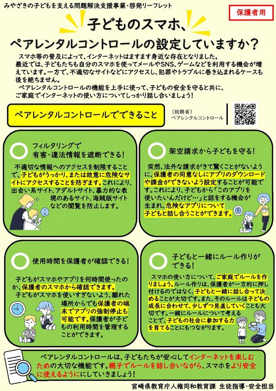 児童生徒がインターネット利用に起因するトラブルを未然に防ぐことができるよう、保護者向けの啓発リーフレットが届きました。ぜひご活用ください。