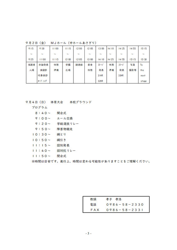 台風11号の接近及びそれに伴う雨のため、9月4日(日)に実施を予定していた「体育大会」を9月8日(木)に延期いたします。したがいまして、今後の予定を以下のように変更いたします。