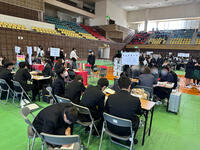 就職希望の生徒は、午後からバスに乗り、早水体育館でジュニアワークフェアに参加しました。進学希望の生徒は、様々な分野の講師の方に来ていただき、自動車産業や漁業、作業療法について勉強しました。