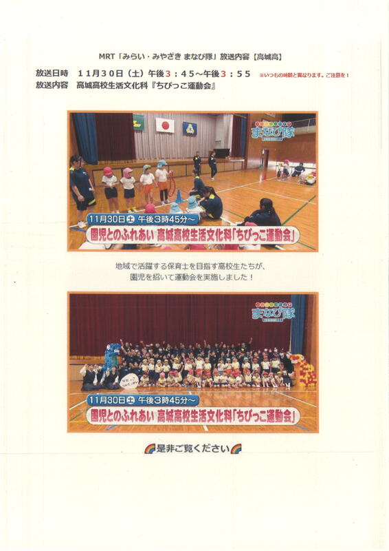 高城高校生活文化科「ちびっこ運動会」の様子が放送されます。ぜひご覧ください。