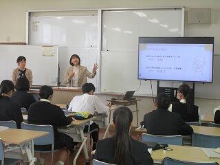 生活文化科3年の保育実践の授業で、11/8(金)山之口地域子育て支援センターで地域の子育て支援を行っていらっしゃるNPO法人職員を講師にお招きし、講義をしていただきました。
