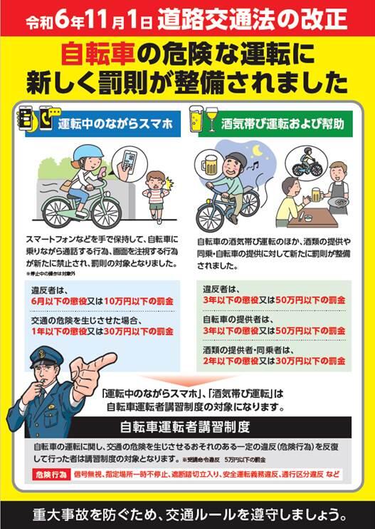 10月の学年PTA等でもお知らせしましたが、11月1日に道路交通法が改正され、自転車の危険な運転に関する罰則が強化されました。高城高校生には運転中のながらスマホが絶対にないようにしたいと考えています。今回の罰則は非常に重くなっています。以下に罰則強化のチラシを掲載していますので、内容を確認の上、家庭でも是非話題にしてください。