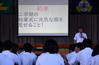 本日、終業式と結団式が行われました。校長先生の話では、約束として2学期の始業式で元気な顔を見せるという約束をしました。生徒指導部からは夏休みの過ごし方についても話を聞きましたね。3年生は人生で最後の夏休みかもしれません。ぜひ、たくさんチャレンジして思い出を作ってください。思い出は色褪せることはありません。主役は君たちだ!!