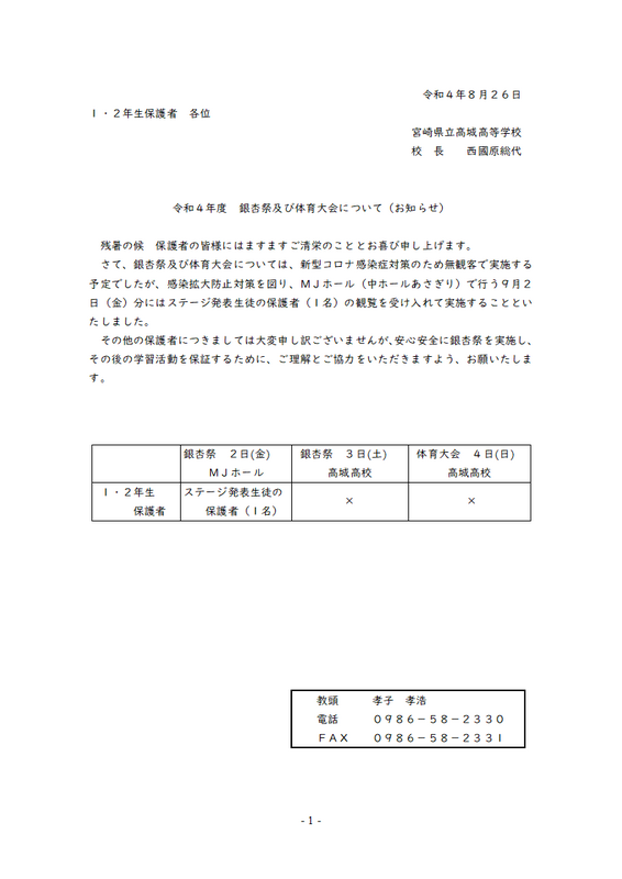 令和4年度 銀杏祭及び体育大会について(お知らせ)