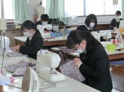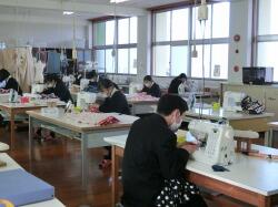 家庭クラブ活動の今年の活動テーマ「SDGs」。今回は、学校にお隣りにある菅公アパレル株式会社高城工場と連携し、制服の製造過程でどうしても出てしまう端切れを活用した、エコバッグづくり講習会を開催しました。第1回は、高城工場に伺い、普段は学生服の製造に使っている工業用ミシンを使用し、つくり方を教えていただきました。第2回は高城高校を会場に、従業員の皆様においでいただき教えていただきました。