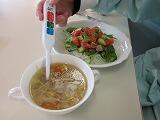 生活文化科3年生フードデザイン選択生徒を対象に、食事バランスと減塩に関する講話、および減塩調理の講習会を実施しました。都城市食生活改善推進委員の皆様に講義をしていただいた後、サーモンとアボカドのポキ丼と包まないワンタンスープの2品を調理しました。スープの塩分測定をしましたが、0.6%という測定値に、普段自分たちがいかに塩分をとっているかを再確認できました。