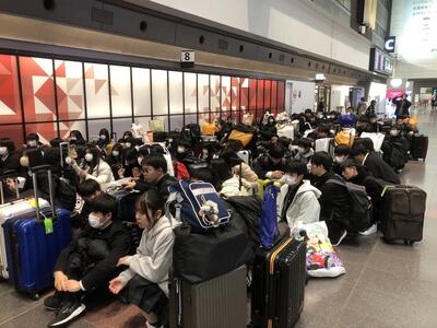 1月9日から12日まで修学旅行です。今朝は5時集合で大変でしたが、送迎等ありがとうございました。宮崎空港では宮崎市内の高校とも重なって混雑しましたが、10分遅れくらいで出発し、羽田空港にはほぼ定刻で到着できました。途中、富士山もきれいに見えました。現在バスで移動中です。次は1日目のスキー研修の様子をお伝えします。武道場での集合の様子