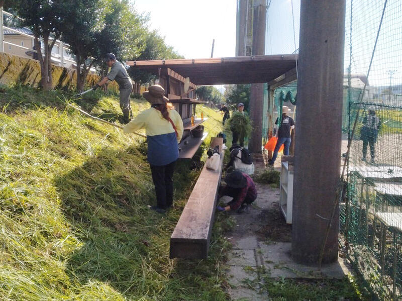 グラウンド全域の草刈りや除草、体育館周辺の側溝の泥土除去、プランターの花の苗植えを行いました。自前の草刈り機や除草を回収する軽トラックなど、保護者の方々の御協力により体調不良等もなく無事に終えることができました。