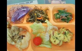 切り干し大根と豆のサラダ・天ぷら・フルーツ・牛肉 です。