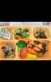 麦ご飯・鮭のマヨネーズ焼き・南瓜と切り昆布の煮物・ハムカツ