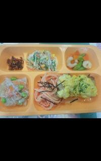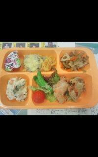 今日のお弁当です。麦ご飯・白身魚のピリ辛チリソース