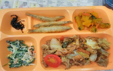麦ご飯・豚のみそ生姜焼き・ポパイサラダ・竹輪の磯辺揚げ
