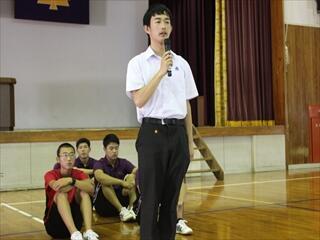 校歌の歌詞と、ハンドボールコートの横にある慰霊碑と「一二三会」についての話をしてくださりました。